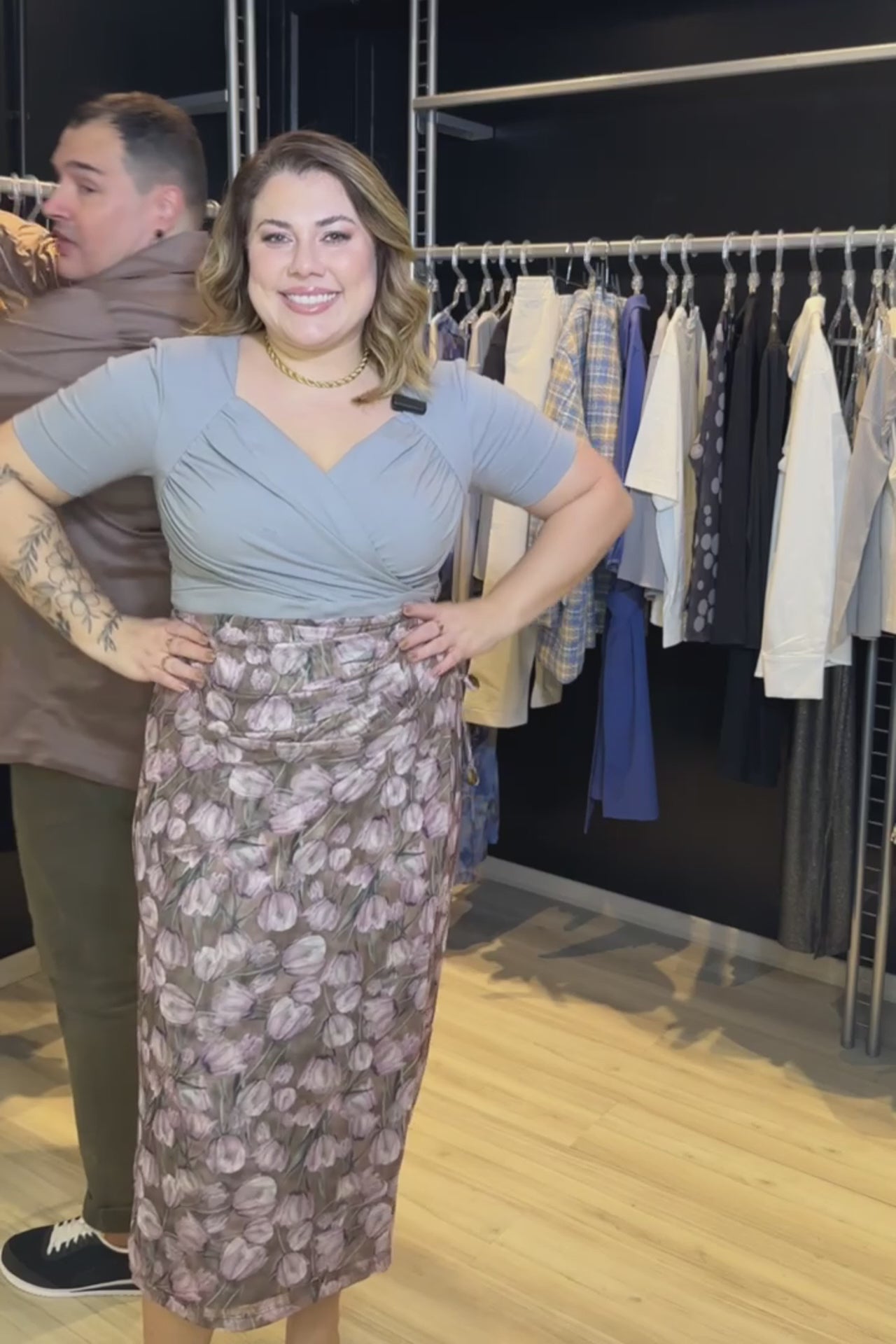 A blusa plus size canelada de manga longa nas medidas 7/8 apresenta decote quadrado que valoriza o colo com delicadeza. O drapeado central e os botões decorativos adicionam charme e feminilidade ao visual.