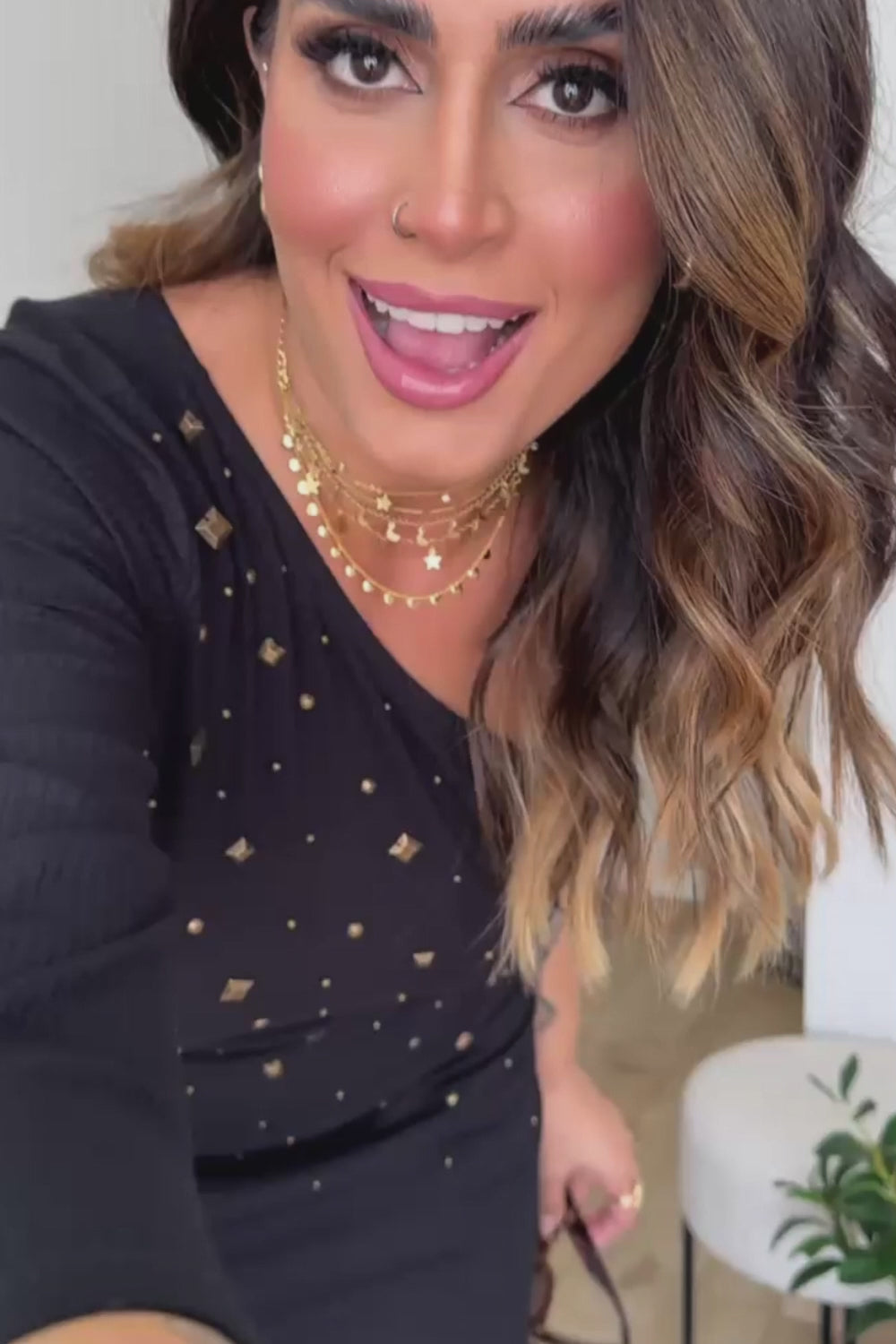 Aplicações de bordados em ouro velho conferem um toque refinado à peça. Combine com a blusa Alana para um look elegante e harmonioso.