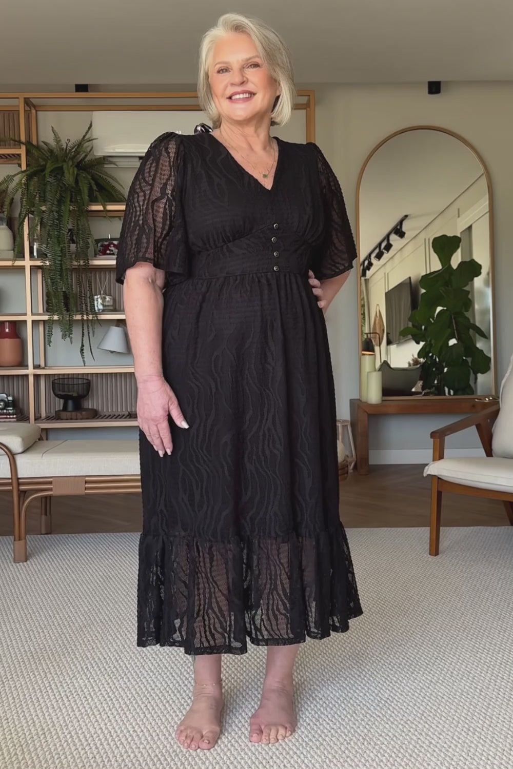 Romantismo e sofisticação em cada detalhe. O vestido midi plus size em renda refinada traz a essência do Boho Chic com design fluido, rendas delicadas e estampas florais Ansellias. O decote V frontal e nas costas valoriza a silhueta, enquanto o laço em cetim estampado adiciona exclusividade e charme. Com modelagem acinturada, saia leve, mangas amplas e recortes no busto, oferece ajuste perfeito. Botões decorativos enriquecem o visual, e o forro garante conforto. Tecido sem elasticidade para caimento estruturado, toque macio e transparência sutil.